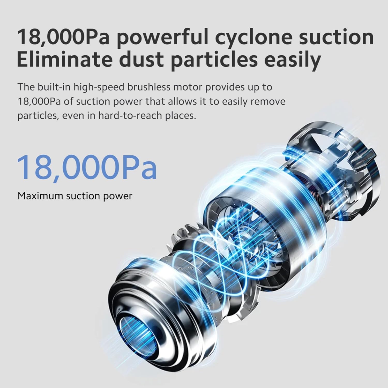 - Powerful Suction: The built-in 215W high-speed brushless motor provides up to 18,000Pa (Turbo Mode) of suction power that allows it to easily remove particles, even in hard-to-reach places